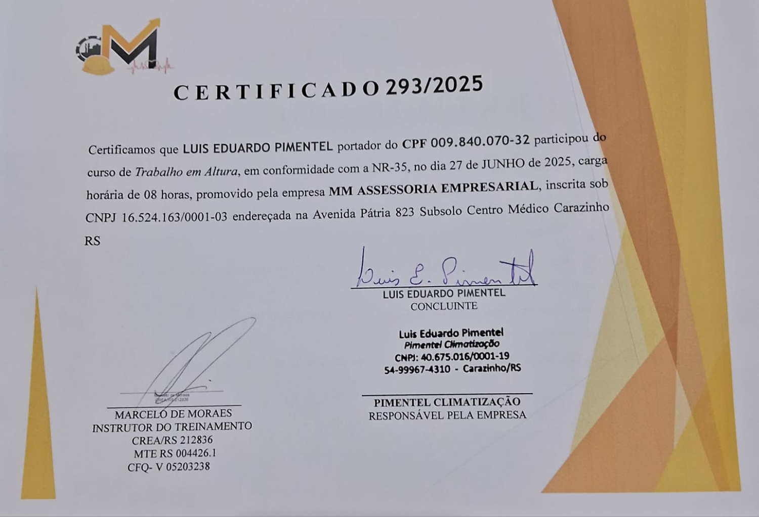 No dia 27/06/2025 nossa equipe participou de um curso de trabalho em altura ,promovido pela empresa MM ASSESSORIA EMPRESARIAL de CARAZINHO RS. Estamos sempre em constante evolução e aprendizado e nos qualificando para melhor atender nossos clientes.